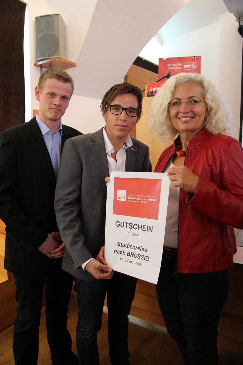 Neben Führungen im EU-Parlament und der Kommission, der Ständigen Vertretung der Rep. Österreich, einem Besuch bei Interessensvertretungen (AK, WKÖ, ÖBB,...) rundet die Reise eine Sightseeing-Tour durch Brüssel ab. Bei einem Treffen mit MEP Kadenbach nahmen JGR Braitner und JG-Mitglied Drapela den Reise-Gutschein für die Jugendlichen persönlich entgegen. „Erstmals möchte ich mich für die zahlreichen Einsendungen der Schüler bedanken und wünsche dem Gewinner in Brüssel viel Spaß. Ich finde es toll, dass es uns gelungen ist, gemeinsam mit MEP Kadenbach einen Kreativwettbewerb zum Thema EU zu initiieren. Gerade in schwierigen und EU-kritischen Zeiten ist es besonders wichtig junge Leute zu motivieren, sich mit diesem Thema zu beschäftigen.“ so JGR und JG-Obmann Michael Braitner.